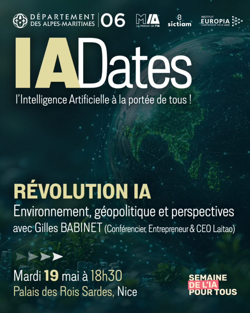 Pour lancer La Semaine de l’IA pour Tous sur le territoire maralpin, la première conférence IADates de l’année se tiendra le mardi 19 mai 2026 au Palais des Rois sardes, à Nice, sur le thème « Révolution IA : environnement, géopolitique et perspectives ».