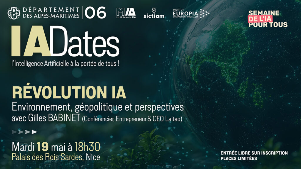 Cet IADate est co-organisé par le Département des Alpes-Maritimes, le SICTIAM, La Maison de l’IA et l’Institut EuropIA.