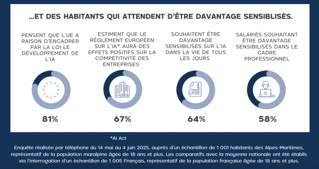 Pour les Maralpins, la solution n’est pas de freiner l’innovation, mais de mieux l’accompagner. En effet, 81% des habitants estiment légitime que l’Union européenne encadre le développement de l’IA et 67% voient dans l’AI Act* un moyen de renforcer la compétitivité et productivité des entreprises.